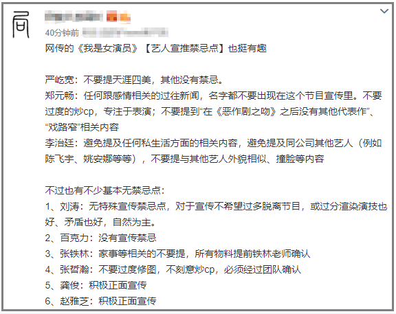 作为一个选女演员的节目,真正参与的女演员刘涛对于宣发的要求是不要过多脱离节目,也不让过分渲染自己的演技。