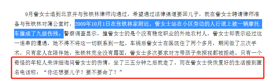 之后,更可怕的事情出现了,孩子被张铁林夺走后。誉晓敏想要回儿子,结果在张铁林家附近被一辆摩托车撞成了九级伤残......