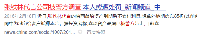 16年,张铁林代言的某资产公司就被曝陷19亿兑付危机,投资者联名称张铁林有连带责任。