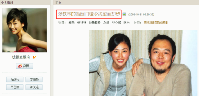 而她曾在一篇博客里,写过张铁林的娶妻要求:“他曾坦率地在我面前说,做他的女人,至少具备三个条件:第一,琴棋书画样样精通;第二,温柔贤惠尊老敬少;第三,博闻强识,会讲英语。”