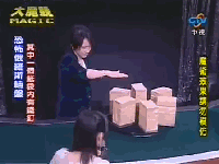 接着,魔术师将四个袋子进行调换,为了不让主持人看到他还特意背过身去。接着,作为示范,他自己用手拍了一个袋子,大意是说他能够感受到哪个袋子里装的是钉子。自己拍完以后,他邀请主持人来拍。女主持人面露难色,表现的很害怕。