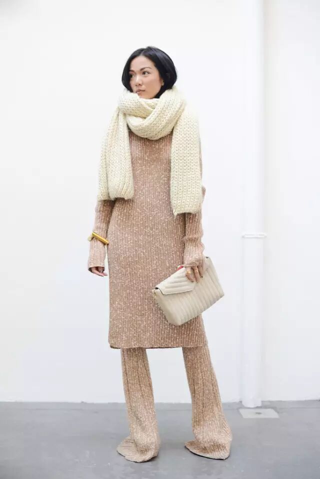 新加坡精品店exhibit店主Yoyo Cao这套Céline针织装以温暖的米褐色调为主,搭配Salvatore Ferragamo手袋又暖又美。