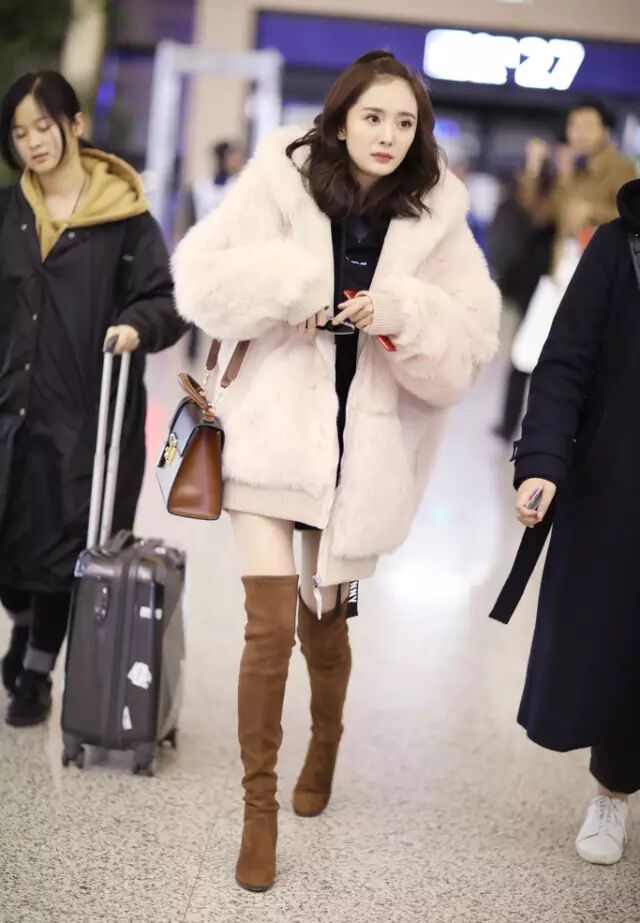 杨幂的Faith Connexion粉色皮草夹克内搭Due Play黑色字母刺绣帽衫,肩背Gucci印花拼接手袋,深棕色麂皮高跟过膝靴来自Stuart Weitzman。