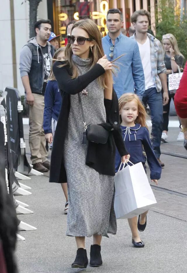 Jessica Alba的Bobeau毛衣裙是最简单的基本款,来一只小巧的Pop & Suki相机包很适合出街。