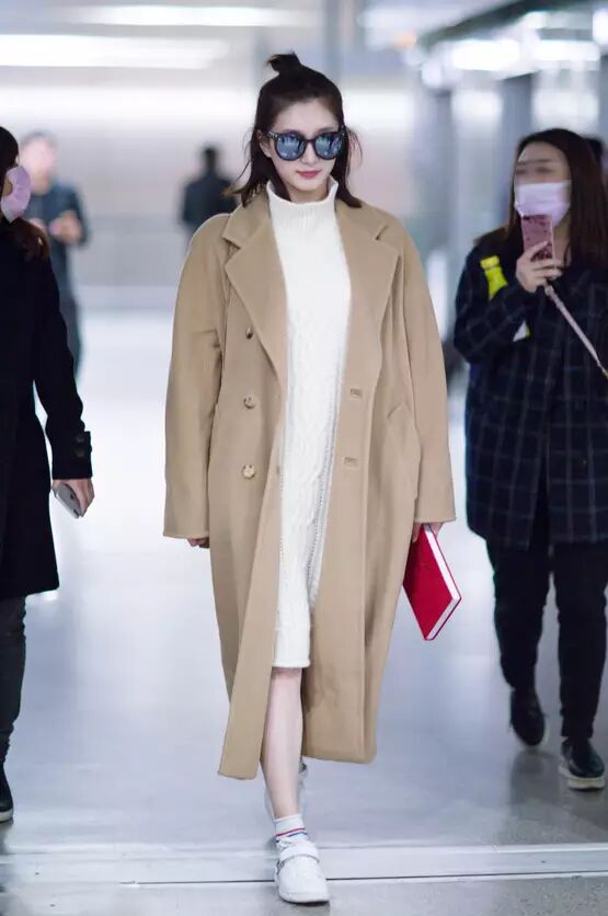 江疏影的机场造型非常简洁,Max Mara的经典驼色大衣与白色针织裙质感极佳,搭配Versus的白球鞋就青春了起来。