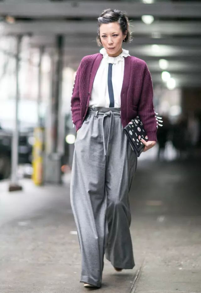 时尚博主Elizabeth Minett的这身灰白色系搭配非常优雅,Zadig&Voltaire粗针织衫搭配Each×Other阔腿裤及Saint Laurent黑色漆皮靴,用Furla的粉色手袋点睛。