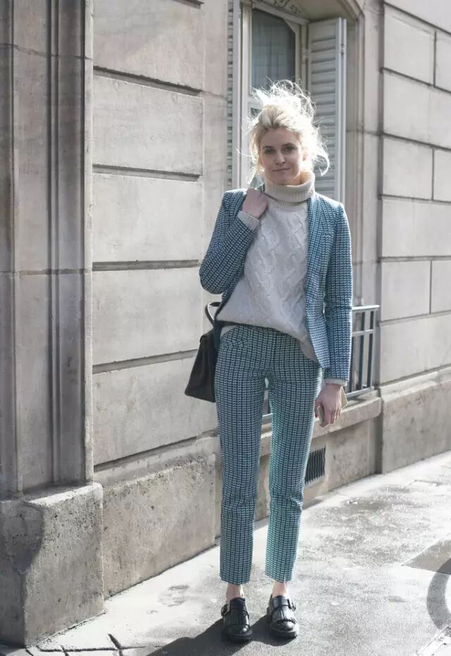设计师Elisa Chalman穿着Promod的花色套装,Sandro的粗棒高领针织衫与Zara的平底鞋打造出帅气模样。
