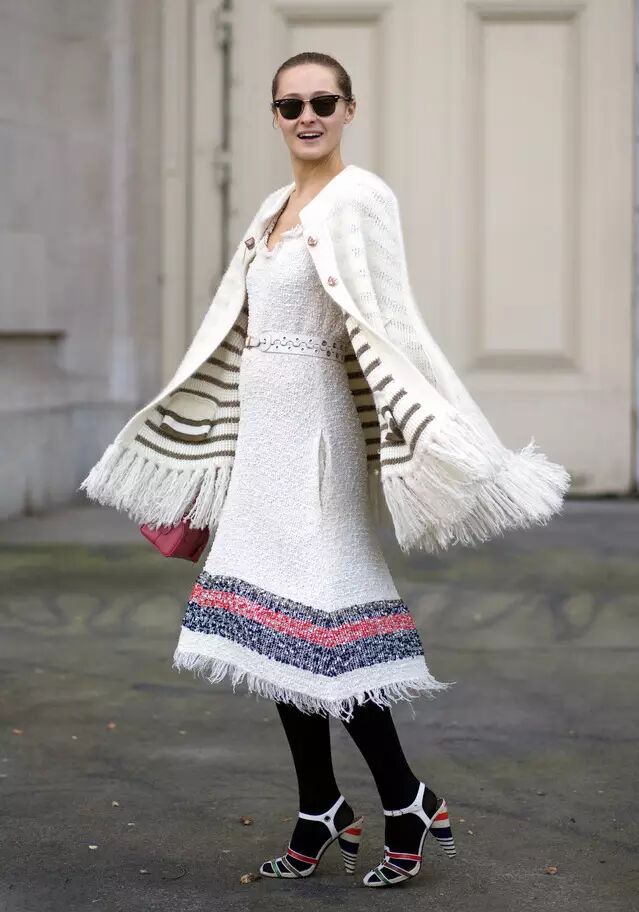 乌克兰时尚偶像Daria Shapovalova也是利用双层针织穿搭,Emilio Pucci的裙装看上去不冷却又轻盈。