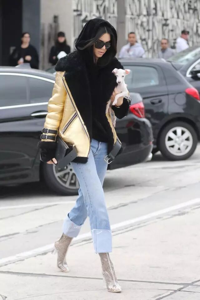 Acne Studios羊羔毛外套再次现身,Kendall Jenner用简单的House of Sunny卫衣搭配Re/done牛仔裤和Ego短靴,造型酷感十足。Dylan Kain黑色手包与Givenchy墨镜相呼应。