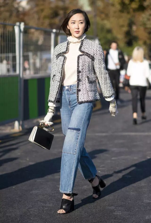 时尚博主Chriselle Lim在荷叶边针织衫外套着的是花呢夹克,这是非常优雅的搭配法。