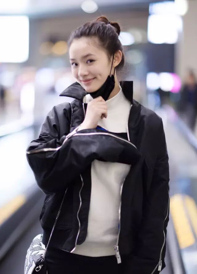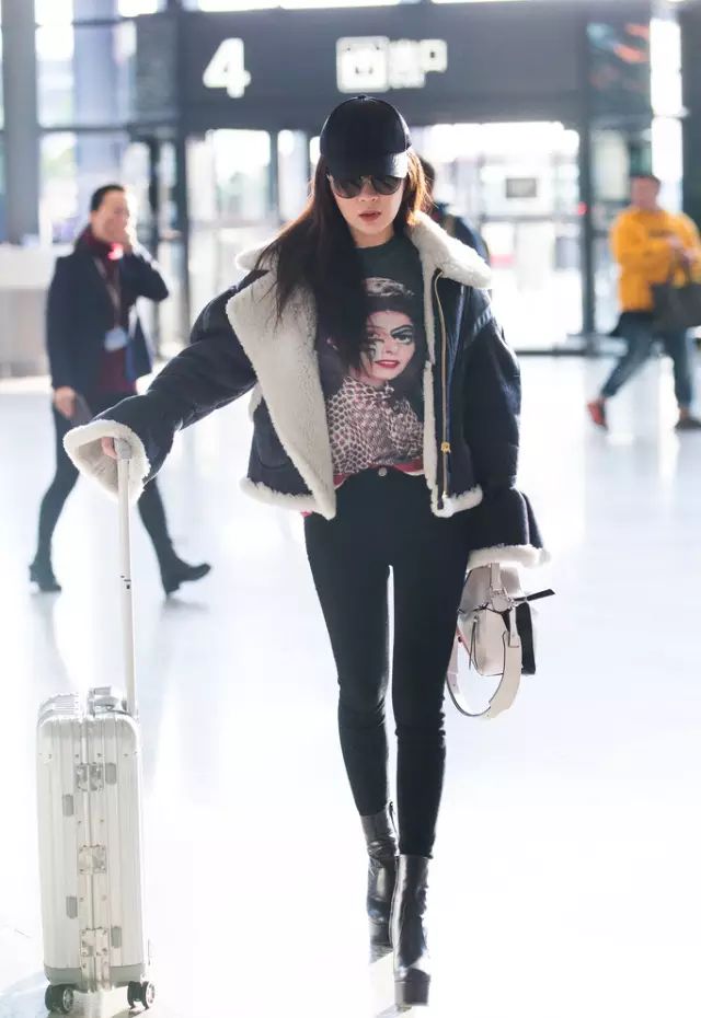 林允以黑色拉链开袖飞行夹克,内搭MO&Co. Monkey King半高领卫衣,肩背Zadig & Voltaire链条包,打造出时髦的机场造型。