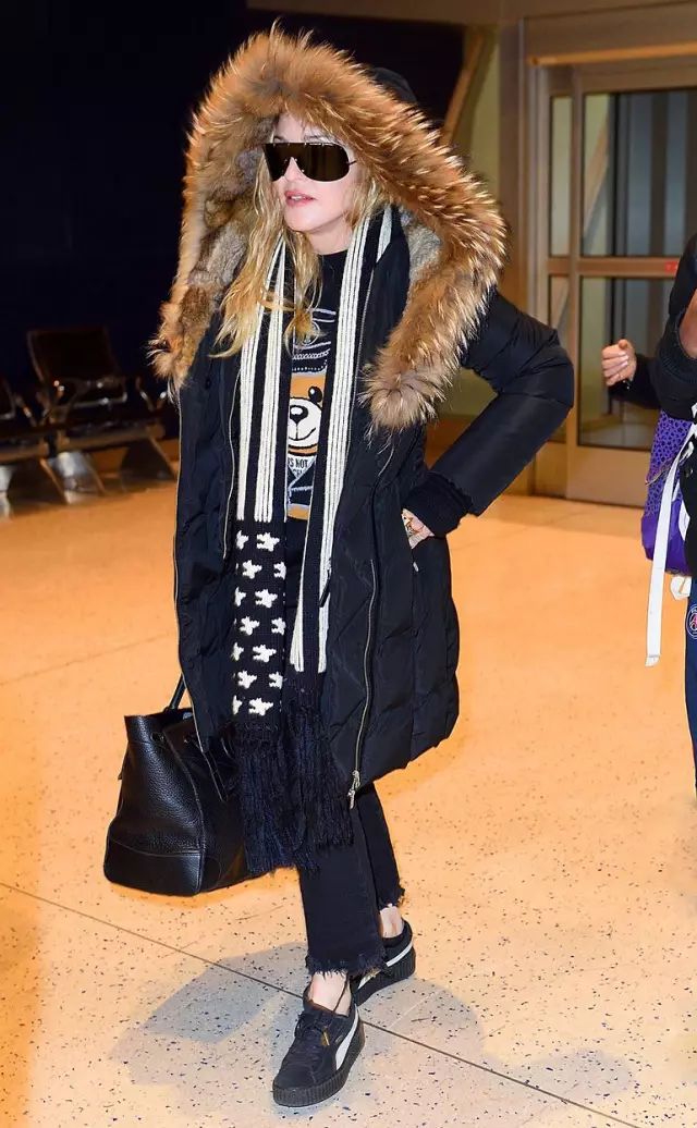 Moschino的小熊针织衫穿在Madonna的身上毫不违和,搭配Rihanna×Puma的运动鞋+Ralph Lauren的手提袋,成熟风格自然流露。