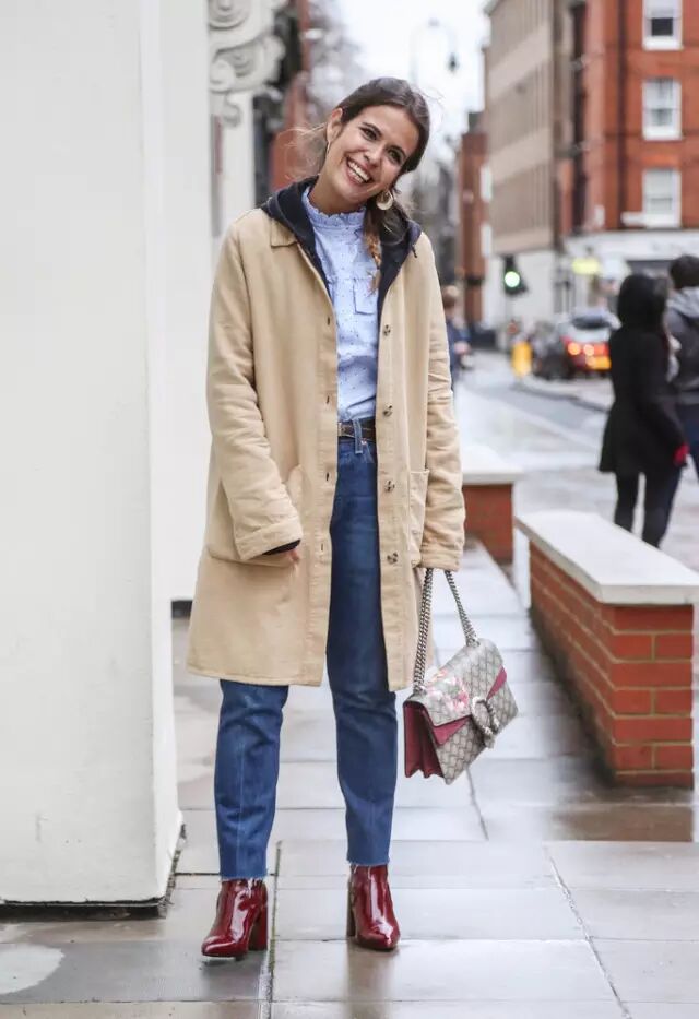 Acne Studio这件羊羔毛外套是今年大热, 时装博主Gala Gonzalez内搭Isabel Marant酒红色粗棒针织衫起到极好的保暖效果。Sandro的毛边牛仔裤与Louis Vuitton的靴子有着极强的潮流感。