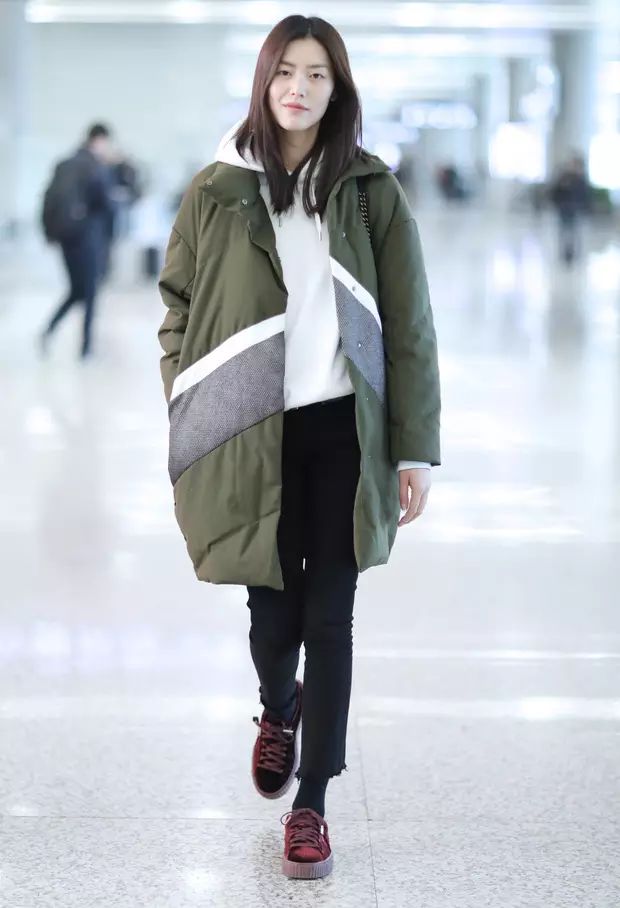 大表姐刘雯现身机场以中国设计师吉承的橄榄绿长款羽绒服,内搭白色连帽卫衣,用Rihanna×Puma的酒红色天鹅绒系带休闲鞋打造强烈的色彩对比。