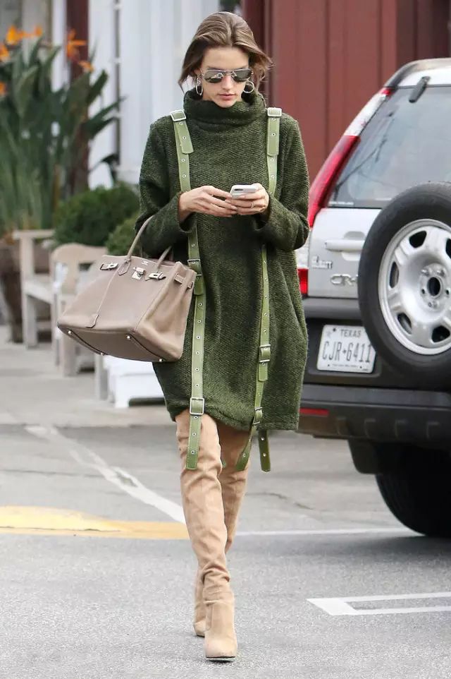 “天使超模”Alessandra Ambrosio的Concepto毛衣裙用上肩带装饰,不花哨又有设计感,搭配意大利奢华品牌Le Silla的砂石色过膝靴非常抢镜。