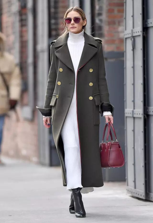 Olivia Palermo,Tibi军绿色双排扣大衣,白色Zara高领针织裙,Jimmy Chor尖头靴。Longchamp的Paris Premier酒红色手袋。时髦就是,大牌混搭高街,挺括兼顾舒适。