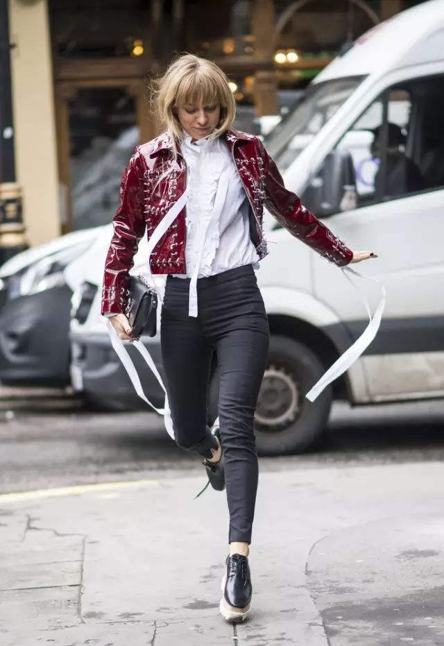 时尚博主Sandra Hagelstam在酒红色漆皮The Kooples夹克下搭配的是白色荷叶边衬衫,不失活力。
