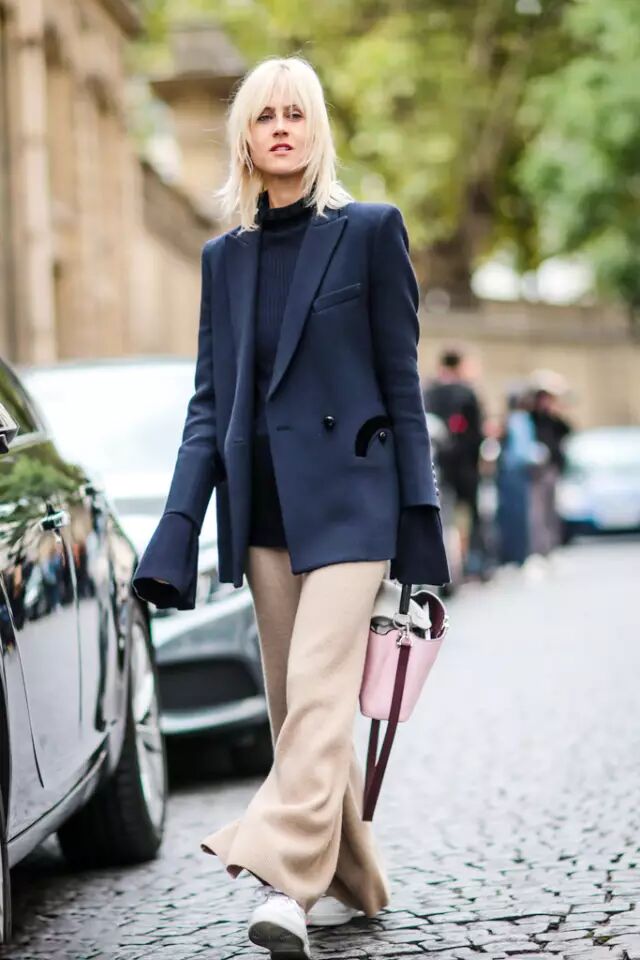 时尚达人Linda Tol则是在藏青色西装与针织衫的搭配中融入驼色针织裤,带着悠闲的帅气。