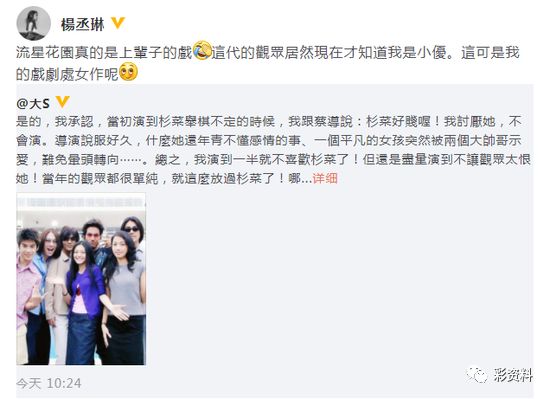 4月25日上午,大S发文吐槽自己演过的经典角色“杉菜”,称自己曾经很不喜欢她,自认“杉菜”是“绿茶”;随后杨丞琳也转发大S的微博吐槽《流星花园》真的是“上辈子的戏”,还调侃观众居然现在才知道自己是剧中“杉菜”的闺蜜“小优”。