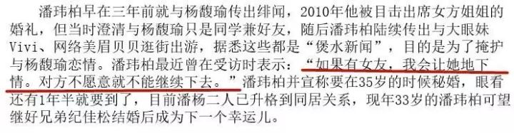 事情还得从2010年说起,当时潘玮柏被拍到跟宝茂建设公司千金杨馥瑜一起现身,参加女方姐姐的婚礼,由此传出了地下恋情,虽然事后称是好朋友,但是台媒依然认定其是潘帅正牌女友。
