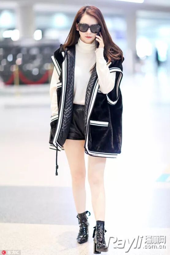 戚薇则选择了廓形感的毛绒马甲混搭热裤和漆皮短靴,酷酷得秀美腿。