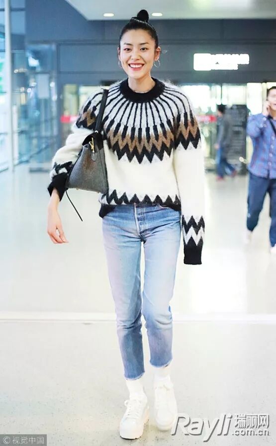 刘雯最近的机场街拍里,可爱逗趣的毛绒印花毛衣,加上俏皮丸子头可爱抢镜。
