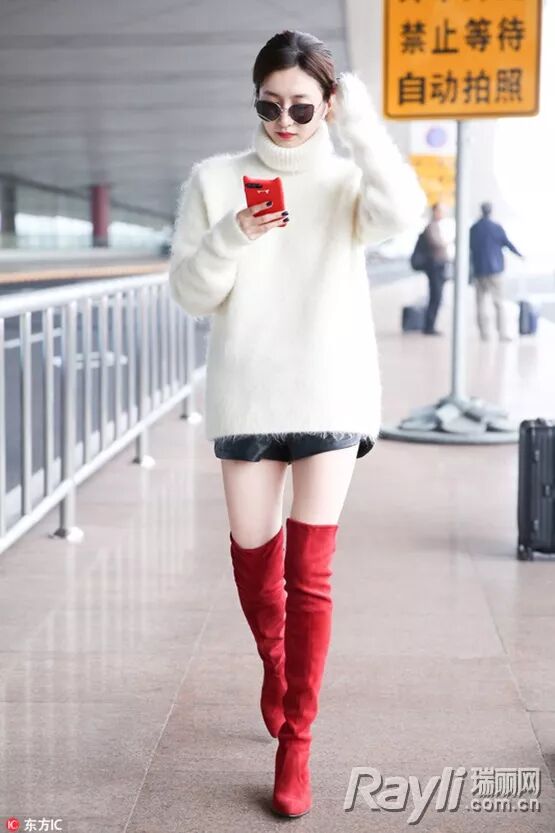 近日,江疏影小姐姐现身北京机场,身穿Saint Laurent 2017秋冬系列白色廓形毛衣,混搭Stuart Weitzman红色过膝靴,美艳又活力。