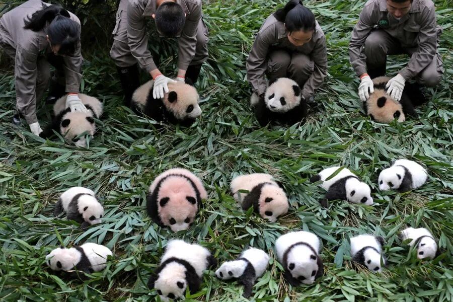 在雅安碧峰峡基地,17只新生熊猫宝宝集合在白熊坪圈舍,排列成三行队伍,最后一排的宝宝们由奶爸奶妈抱着,集体向公众问好。截至目前,2017年中国大熊猫保护研究中心共繁育大熊猫30胎,成活42仔,大熊猫繁育数量创历史新高。
