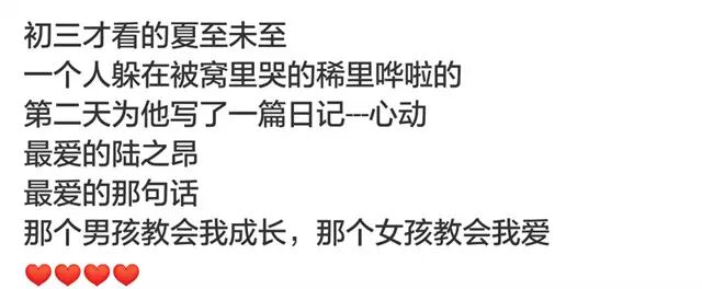 白敬亭饰演的陆之昂则引发了一众网友的怀旧少女心,不禁纷纷咆哮自己读书时为什么没有遇到一个陆之昂,还个个送上了自己写给陆之昂的情书。或者当年初中时看完小说哭得稀里哗啦、第二天毅然给陆之昂写下“心动”的日记;或者回忆起书里陆之昂的种种细节:他怕冷、他在日本遇到一个很像傅小司的男生、他在大家都高考完才说出自己要离开的消息,最后粉丝轻轻地送上这一句,“你好,陆之昂”。