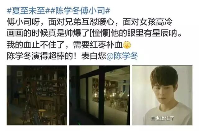 陈学冬饰演的傅小司高冷帅气,在同学眼中是不费吹灰之力就可以轻松拿第一的奇怪人类。剧播出后,网友评论其面对兄弟互怼、面对女孩冷漠的表现都很到位,而且画画的时候超级帅,简直就是一枚“眼睛里有星辰”的男孩纸。