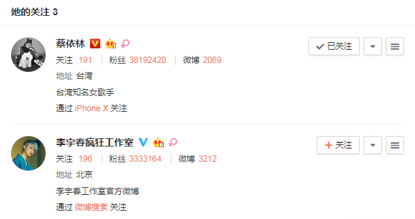 ▲因为二锅头结缘实在是女明星中的清流了,而两位的名字,LYC和CYL也非常巧合。看看春春的关注列表,蔡依林是她第一个也是唯一一个关注的女明星,关系有多好还需要多证明吗?