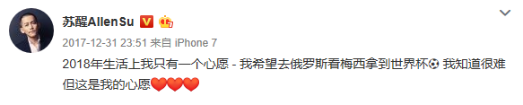微博上几乎隔几天就会对梅西表白一次,2017年末给自己许的愿望也是希望梅西能拿下今年的世界杯。