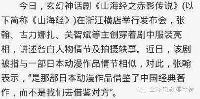 指出《山海经》第14集中,百里寒手下霜儿的角色设定和动漫《火影忍者》中的君麻吕极为相似,2者都拥有神秘的血统,再失去族人之后被反派所救,从此变成恶人的手下。而且就连剧里剧中百里寒对霜儿所说的台词,被指和《火影忍者》中大蛇丸对君麻吕所说的经典对话几乎一模一样,让不少火影迷怒批“根本复制贴上”、“电视剧都抄起动漫了”、“编剧这么好当”……