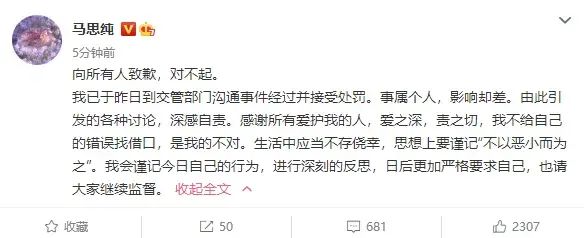 “我已于昨日到交管部门沟通事件经过并接受处罚。事属个人,影响却差。由此引发的各种讨论,深感自责。感谢所有爱护我的人,爱之深,责之切,我不给自己的错误找借口,是我的不对。生活中应当不存侥幸,思想上要谨记‘不以恶小而为之’。我会谨记今日自己的行为,进行深刻的反思,日后更加严格要求自己,也请大家继续监督。”