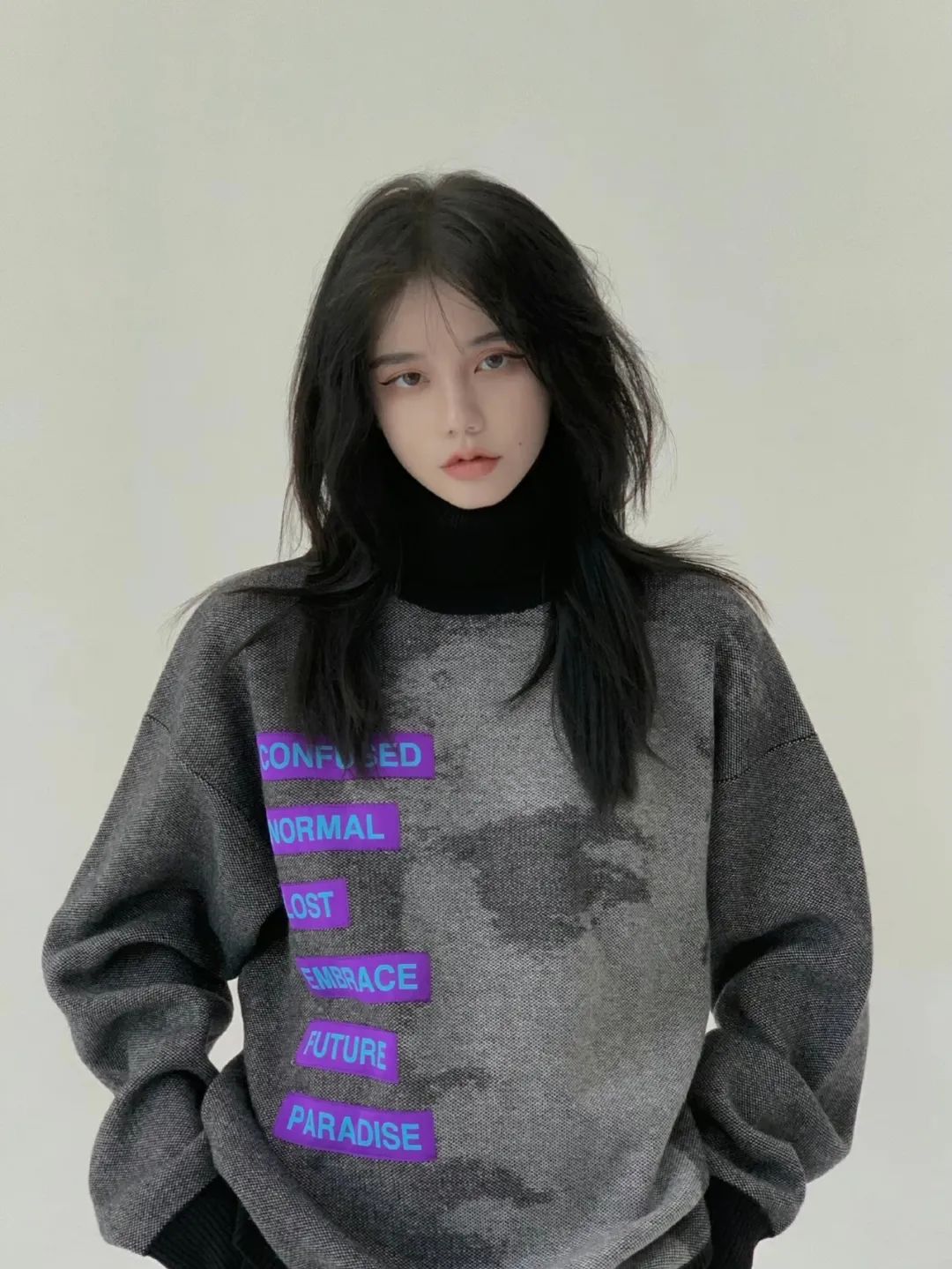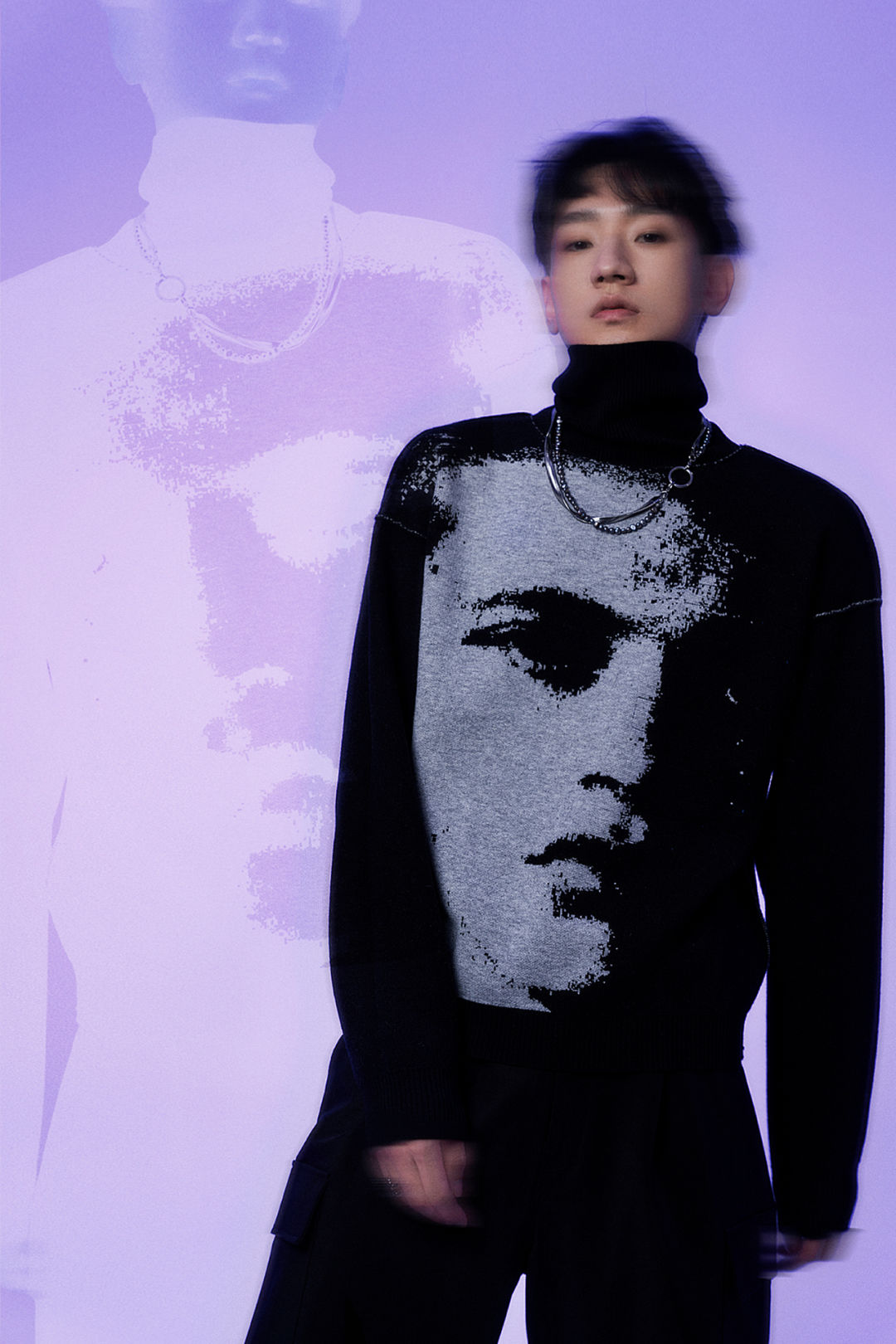 可双面穿着的「高领毛衣」亦是系列亮点,正面纯黑配色,作了人像铺满处理,反面则为深灰,淡化人像后增加标语贴布;
