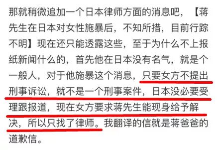 没多久就又有爆料称,蒋劲夫家暴女友后躲了起来,一直是他的父亲在出面和受害女方以及律师周旋。也是他的父亲道歉,称自己没有教育好蒋劲夫。