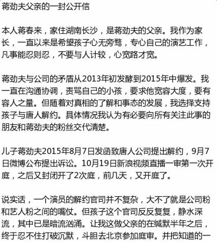 联想到蒋劲夫之前和唐人解约时,也是让父亲出面道歉的事,