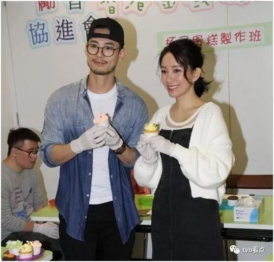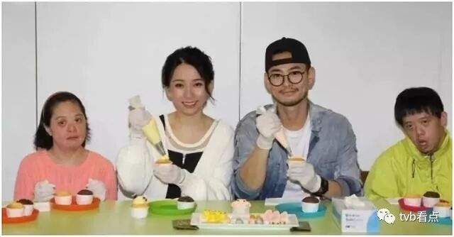 照片可见,文凯玲很有爱心的和何浩文一同和残障人士坐在一起,放在他们面前是还未完成的蛋糕半成品,但是已经依稀可以看出那精美的模样。
