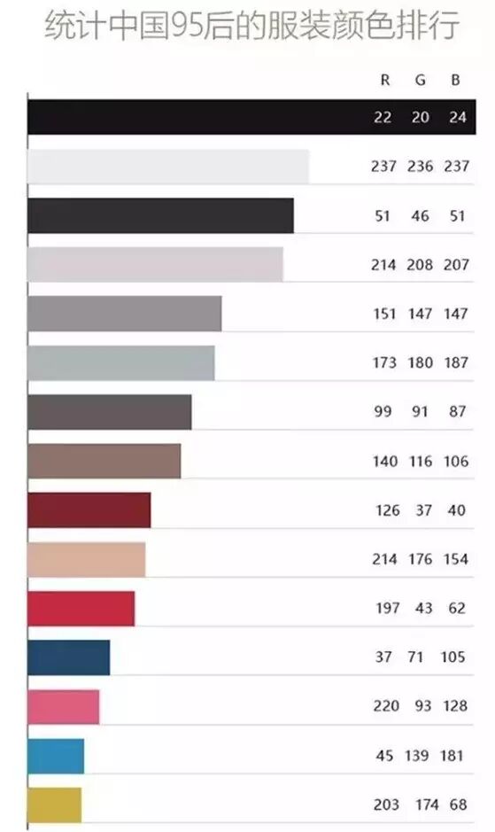 除了“95度黑”,中国95后年轻人最常穿的服装颜色还包括: