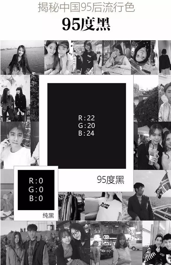 《报告》指出,中国“95后”年轻人最喜欢的颜色是RGB值为22/20/24的“黑色”,不同于RGB值为0/0/0的纯黑色,因此将其命名为“95度黑”。