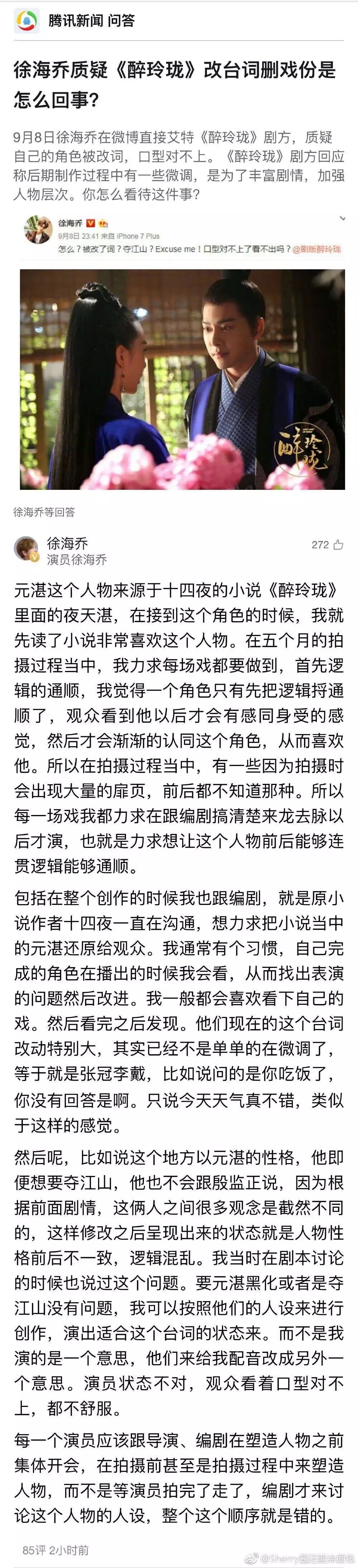 他上一次上热搜,还是因为质疑《醉玲珑》这个剧组更改台词,使人物前后不合理。一个不出名的十八线,当众diss一部这样班底这样制作的电视剧,完全是冒着被封杀的危险做的。