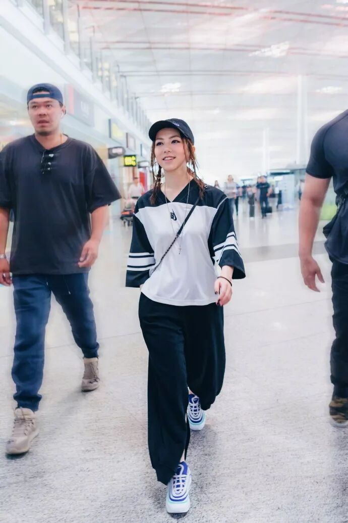 在机场春风满面的紫棋,脚底踩着Nike Air Max 97「Grape」配色。