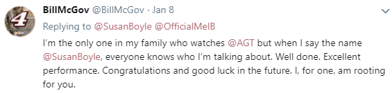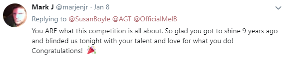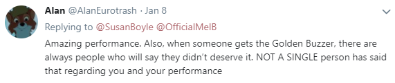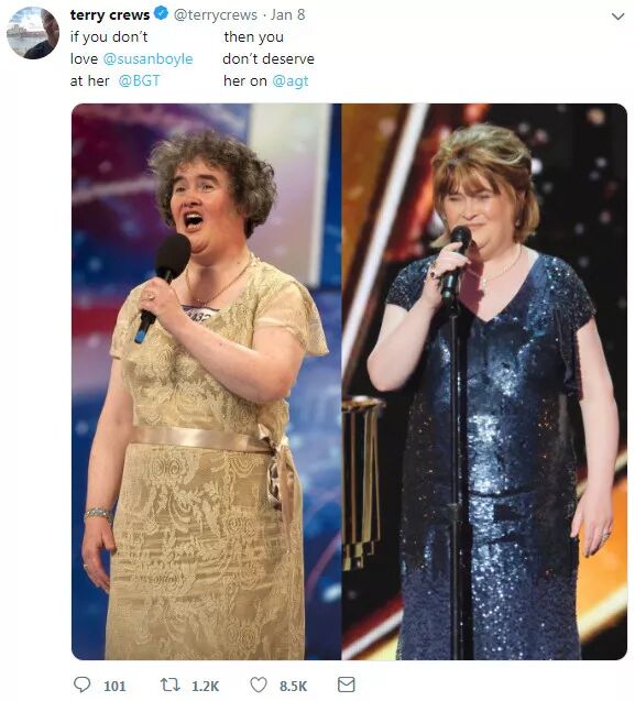 网友们对她回归达人秀舞台表示热烈欢迎和支持。美国橄榄球运动员泰瑞·克鲁斯在推文中说道:如果你不喜欢英国达人秀上的苏珊,那你也不配欣赏她在美国达人秀的精彩表现。