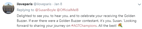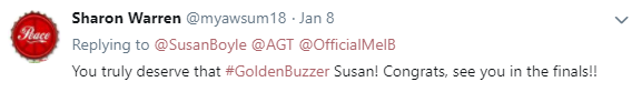非常高兴能够再次看到你,听到你的声音,并且一起庆祝你得到黄金直通按钮。如果只能有一个选手得到黄金按钮,绝对是你,苏珊大妈。期待看到你在美国达人秀舞台上越来越好。