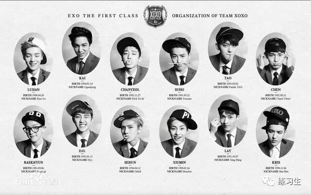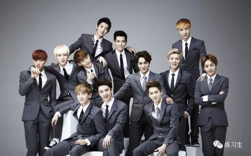 最初的EXO组合,由成员金珉锡、金俊勉、张艺兴、鹿晗、吴亦凡、黄子韬、边伯贤、金钟大、朴灿烈、都敬秀、金钟仁、吴世勋十二人组成。如今EXO在韩国娱乐圈的地位,几乎可以说是无人能及,推出的单曲此次占据排行榜第一的位置,年末的音乐大赏更是拿奖拿到手软,成员在不同领域的个人发展也是非常优异。即便新冒出的男子团队众多,渐渐拔尖的团体也崭露头角,但是依旧无人能够动摇EXO的位置,以及在粉丝心目中的地位。