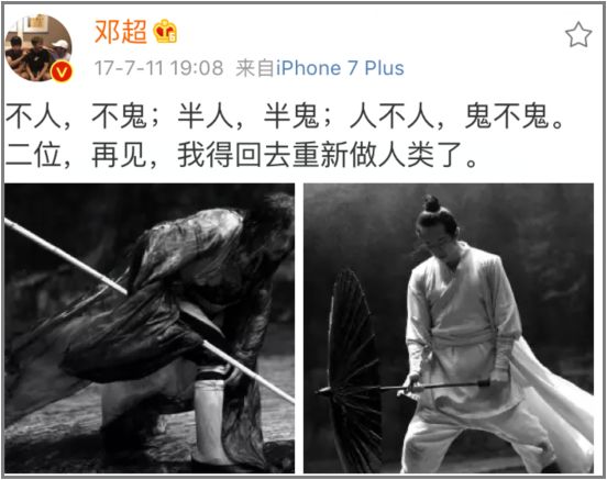 杀青之后,邓超发微博说:“不人,不鬼;半人,半鬼;人不人,鬼不鬼。二位,再见,我得回去重新做人类了!”