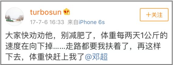 当时孙俪都发微博表达了担心,邓超瘦得走路都要她扶着,体重快赶上她了。