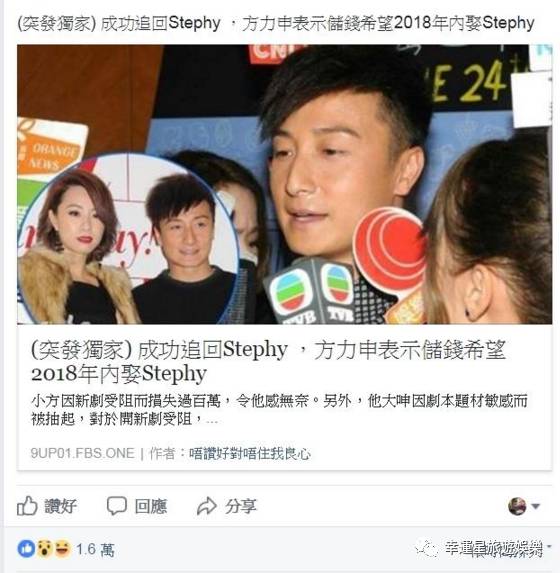 方力申日前出席活動時,表示有留意網上流傳的報導,內容他看過,是事實的不夠百分之十,不過現在大家多數隻看標題,不看內容,所以好多人恭喜他,但沒人向他求證真假。不過,他笑言可能真是2018年結婚,錢是要存的,但複合不會了。