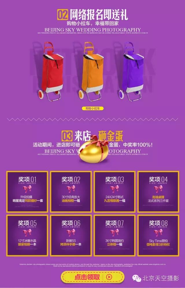 进店砸金蛋100%中奖,奖项设定有:明星1.0礼服/油画框/九宫格/法式桌摆三件套/微电影等一系列大奖;
