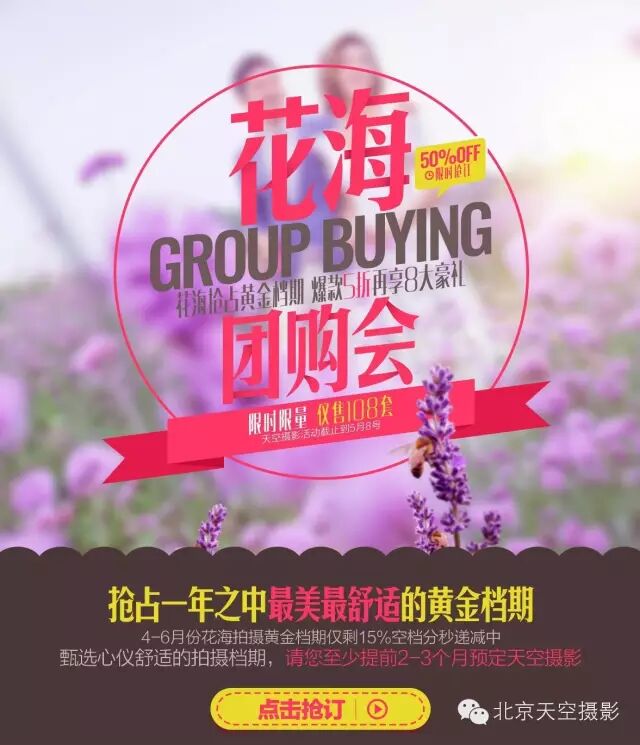 天空摄影爆款5折再享8大豪礼抢占花海黄金档,截止到5月8号限时限量仅售108套,抢占一年之中最美最舒适的黄金档期